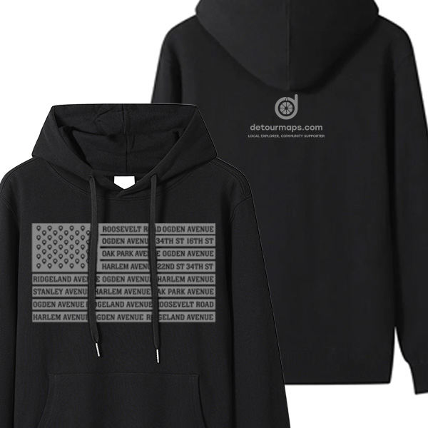 This design reinterprets the American flag by integrating the names of neighborhood streets, symbolizing the vibrant community life that develops along every local corridor and urban path. Every piece is custom made by detour22, the creative soul of Detour Maps, ensuring your style is rooted in neighborhood authenticity. Please note that because our designs are individually crafted, they have certain limitations; actual colors, textures, and appearances may vary slightly from digital representations.
