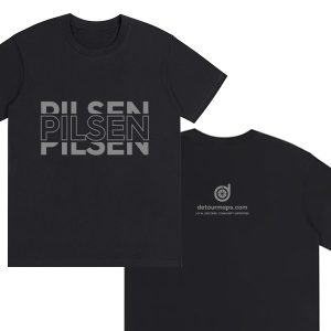 This design features the name of Pilsen in a repeating graphic pattern, symbolizing a neighborhood identity that is constantly reaffirmed by its people and culture.