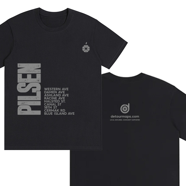 A tribute to the iconic avenues that build our identity. This design lists the streets of Pilsen as an emotional map, celebrating the stories, encounters, and daily rhythm of the neighborhood. More than a list, it’s a wearable piece of the block’s soul. Rep your neighborhood. Wear your story. [Source Query, 1118].