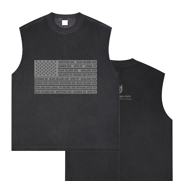 This unisex reverse washed tank top offers a graphic reinterpretation of the American flag, replacing traditional stripes with the iconic street names of Pilsen. It is a design that celebrates your local identity while honoring its place within the broader American cultural context.