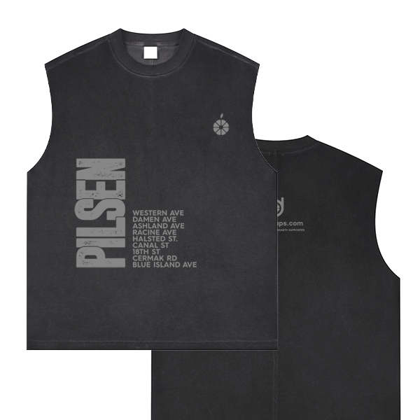 This unisex reverse washed tank top honors the iconic streets of Pilsen, listing them as an emotional map where every name symbolizes the stories, encounters, and daily “cotidiarias” of the neighborhood.